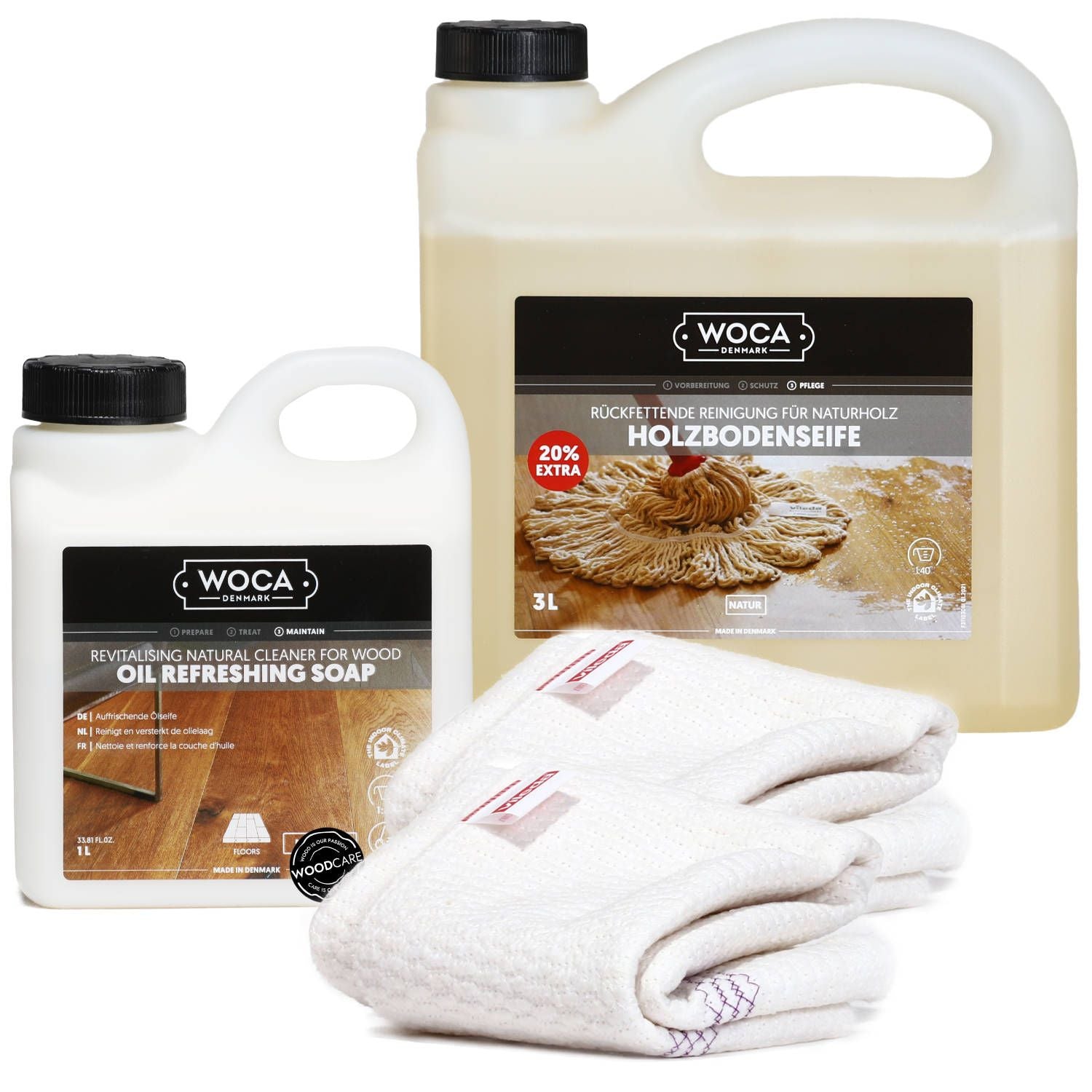 Das WOCA Spar-Pflegeset für Geölte Böden klein eignet sich perfekt für die regelmäßige Pflege und Reinigung. Der WOCA Ölrefresher frischt die geölten Holzböden auf, während die WOCA Holzbodenseife eine sanfte, aber effektive Reinigung bietet. Die Vileda Bodentücher erleichtern die Anwendung und hinterlassen keine Rückstände.